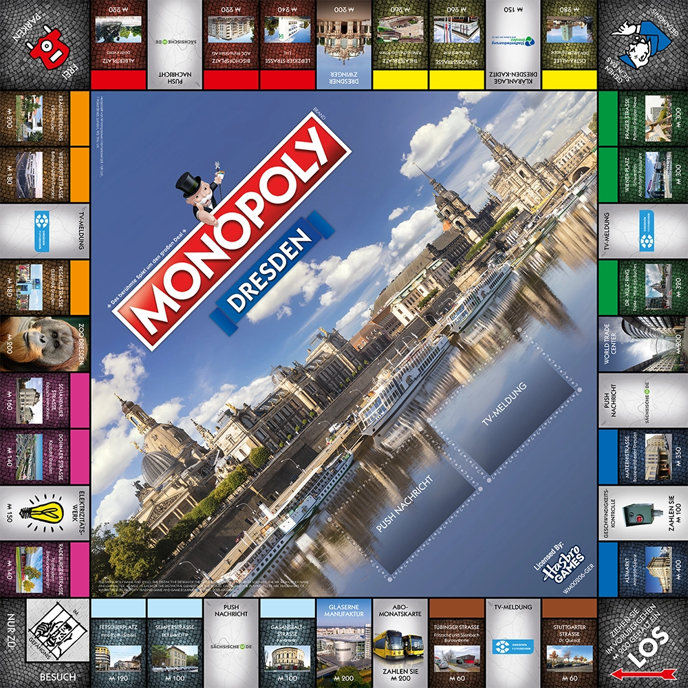 Auf geht’s also: Errichten Sie Hotels am Theaterplatz und kaufen Sie sich den Dresdner Zoo! Investieren Sie in den Altmarkt, die Prager Straße oder den Wiener Platz und steigen Sie so zum Großgrund- und Immobilienbesitzer auf, in einer Stadt, die seit Anfang des 19. Jahrhunderts in Würdigung ihrer Kunstsammlungen und ihrer Architektur den Beinamen Elbflorenz trägt.