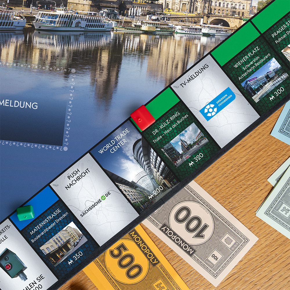 Aber Dresden kann noch mehr! Die Stadt gehört zu den wirtschaftlich pulsierendsten Städten in Deutschland. Da zahlt man doch gern seine Steuern, wenn man auf den Meldungsfeldern die passende Karte zieht. Und selbst wenn man mal all seine Hotels am Altmarkt für viel Geld sanieren muss, fällt einem echten Spieler dabei kein Zacken aus der Krone August des Starken!