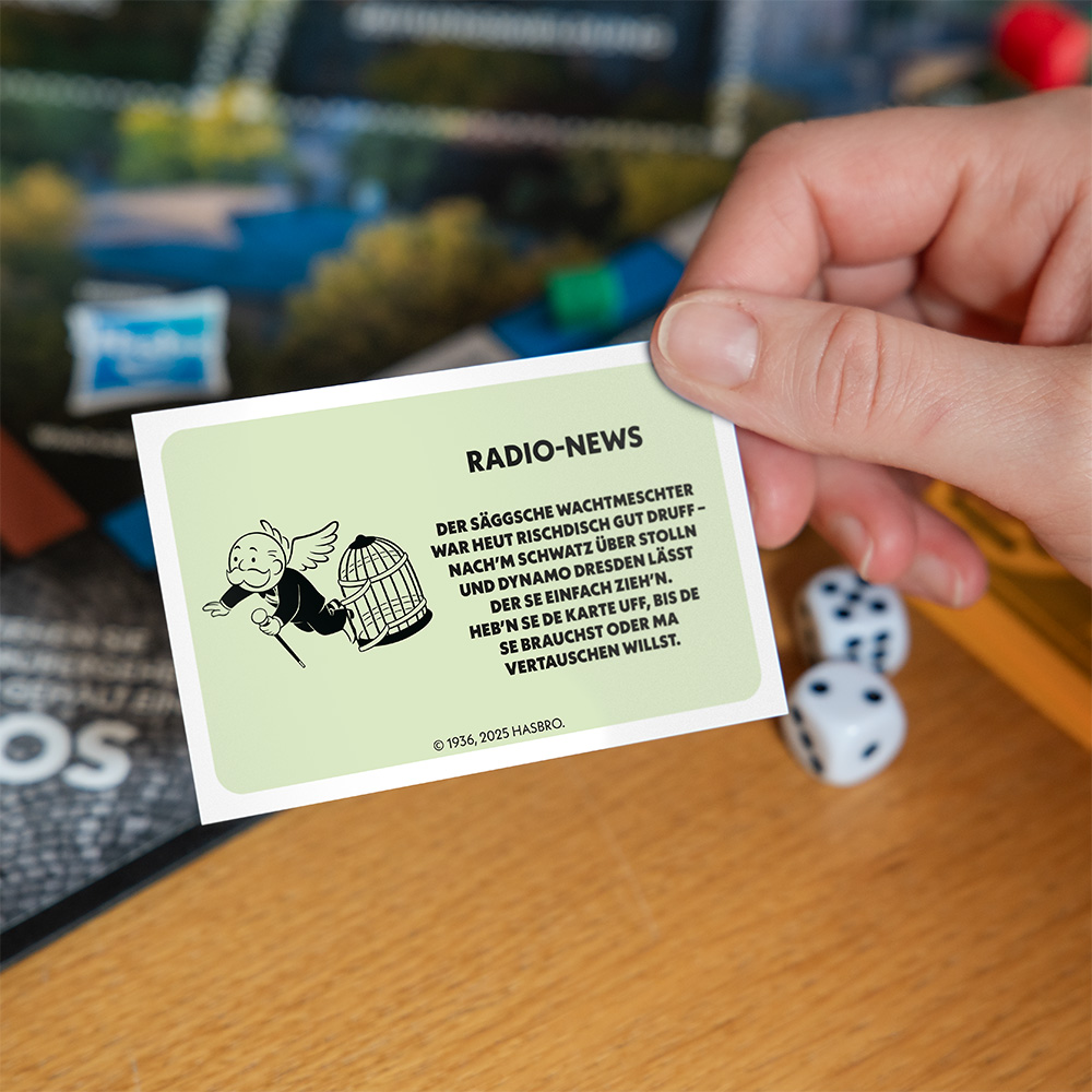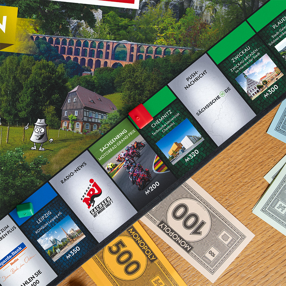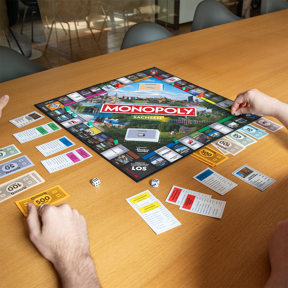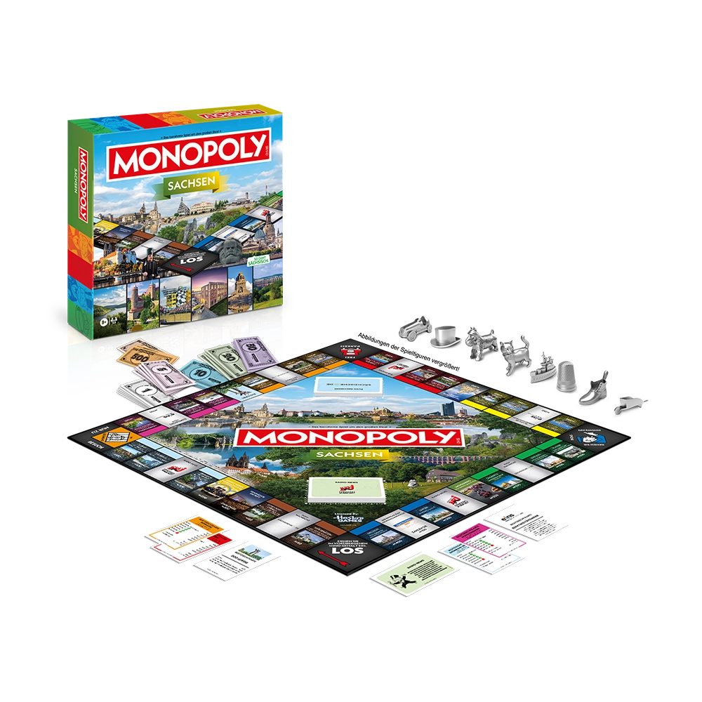 Die MONOPOLY Edition Sachsen bringt die Vielfalt des Freistaats auf das Spielbrett. Sichern Sie sich den Leipziger Zoo, die Dresdner Frauenkirche oder den Sachsenring und lassen Sie Ihre Mitspieler zahlen. Doch Vorsicht vor der Zusatzsteuer! Eine Pause im Gefängnis? Zeit für eine sächsische Eierschecke und neue Pläne für Ihre Investitionen in Sachsen!